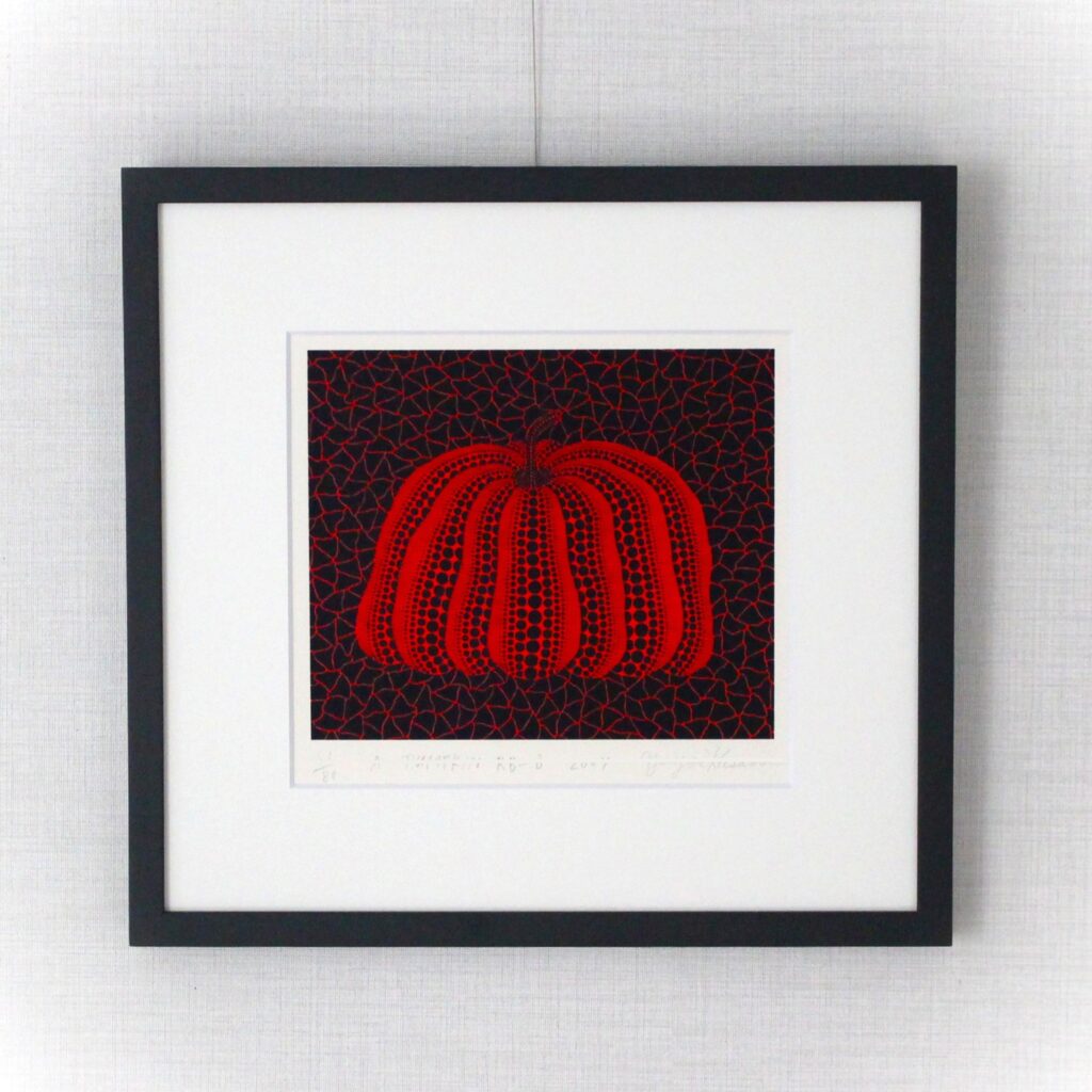 本作品は、草間彌生の代表的なモチーフであるかぼちゃの作品です。比較的小さなサイズですが、鮮やかな赤いかぼちゃは存在感抜群でポップな華やかさがあります。